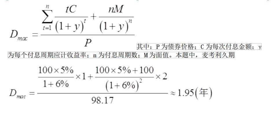 某2年期债券面值100元,票面利率为5%,每年付息,现在的市场收益率为6%,市场价格98.17元,则其麦考利久期是()。A.1.95年 B.2.05年 ...