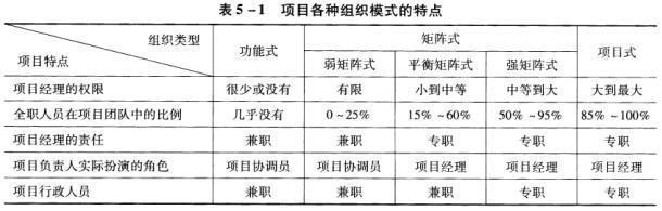 解析 如表5-1所示,在平衡矩阵式组织模式中,全职人员在项目团队中的比例为15%~60%,且有专职的项目经理。